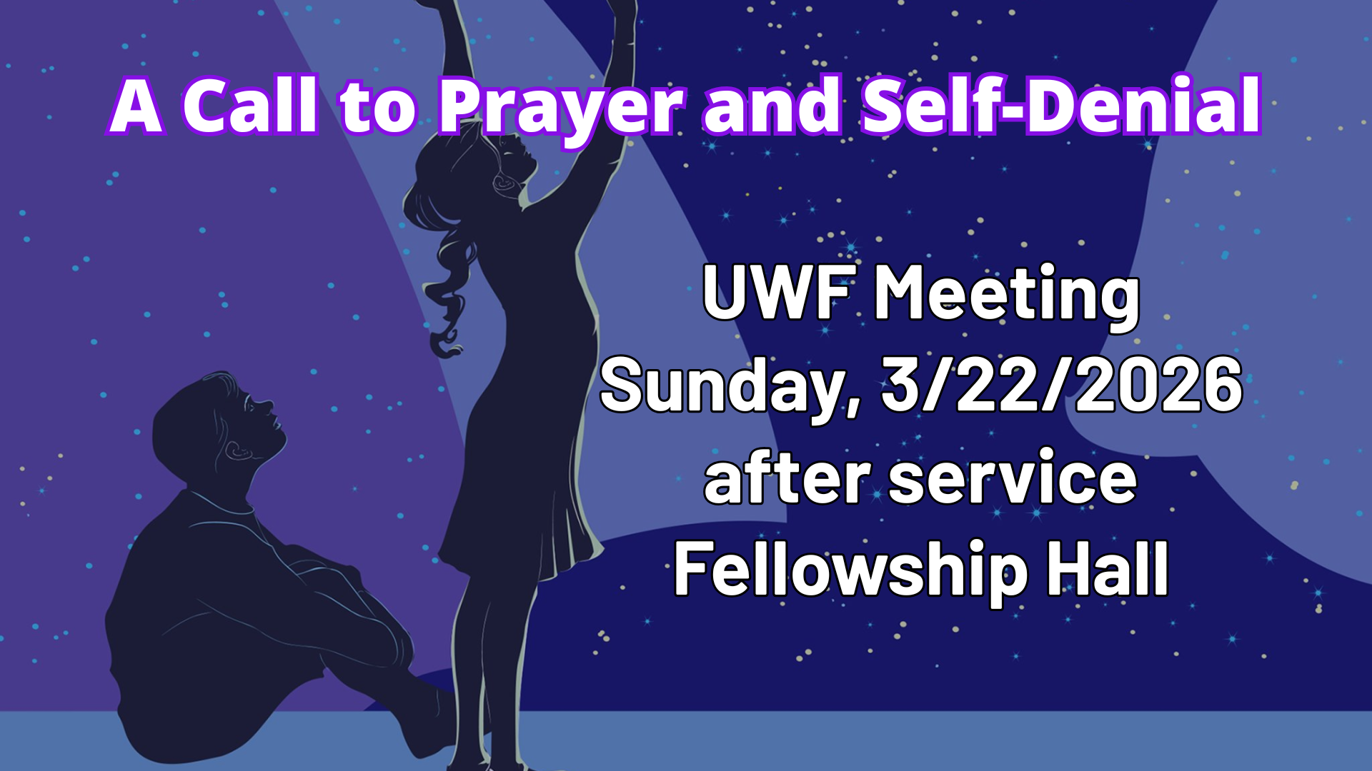 The United Women in Faith will host our Prayer and Self-Denial Service on Sunday, March 22nd at 12:30 PM in the Fellowship Hall. Enjoy a delicious lunch of soups, salads, desserts, and drinks. We look forward to seeing you!