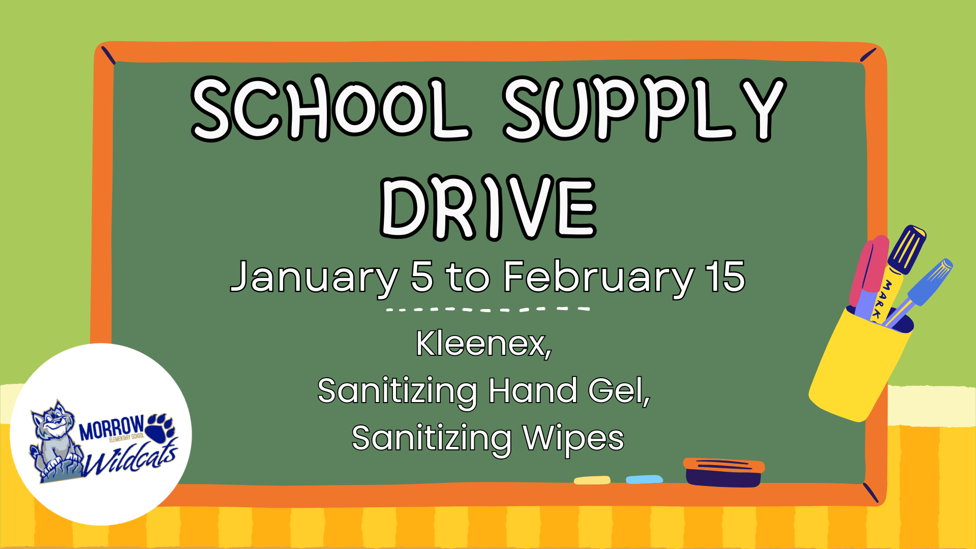 Morrow First UMC is collecting items to support Morrow Elementary School’s teachers during flu season. You can drop off Kleenex, Sanitizing Hand Gel, Sanitizing Wipes, until February 15.