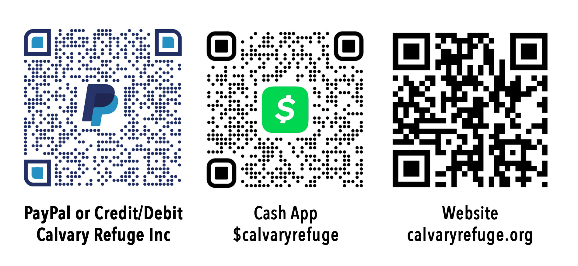 If you feel led, you may give through Credit/Debit Cards, PayPal, Cash App and through our website at CALVARYREFUGE.ORG. Every contribution helps us continue the work that has been ongoing for over 40 years in Clayton County and surrounding communities.